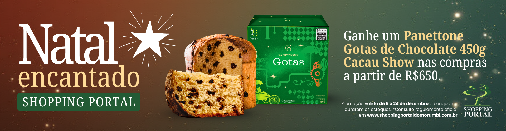 Nas compras a partir de R$650, você ganha um Panettone Gotas de Chocolate 450g Cacau Show, um clássico irresistível que combina com todos os momentos dessa deliciosa época do ano 🎁 🎅